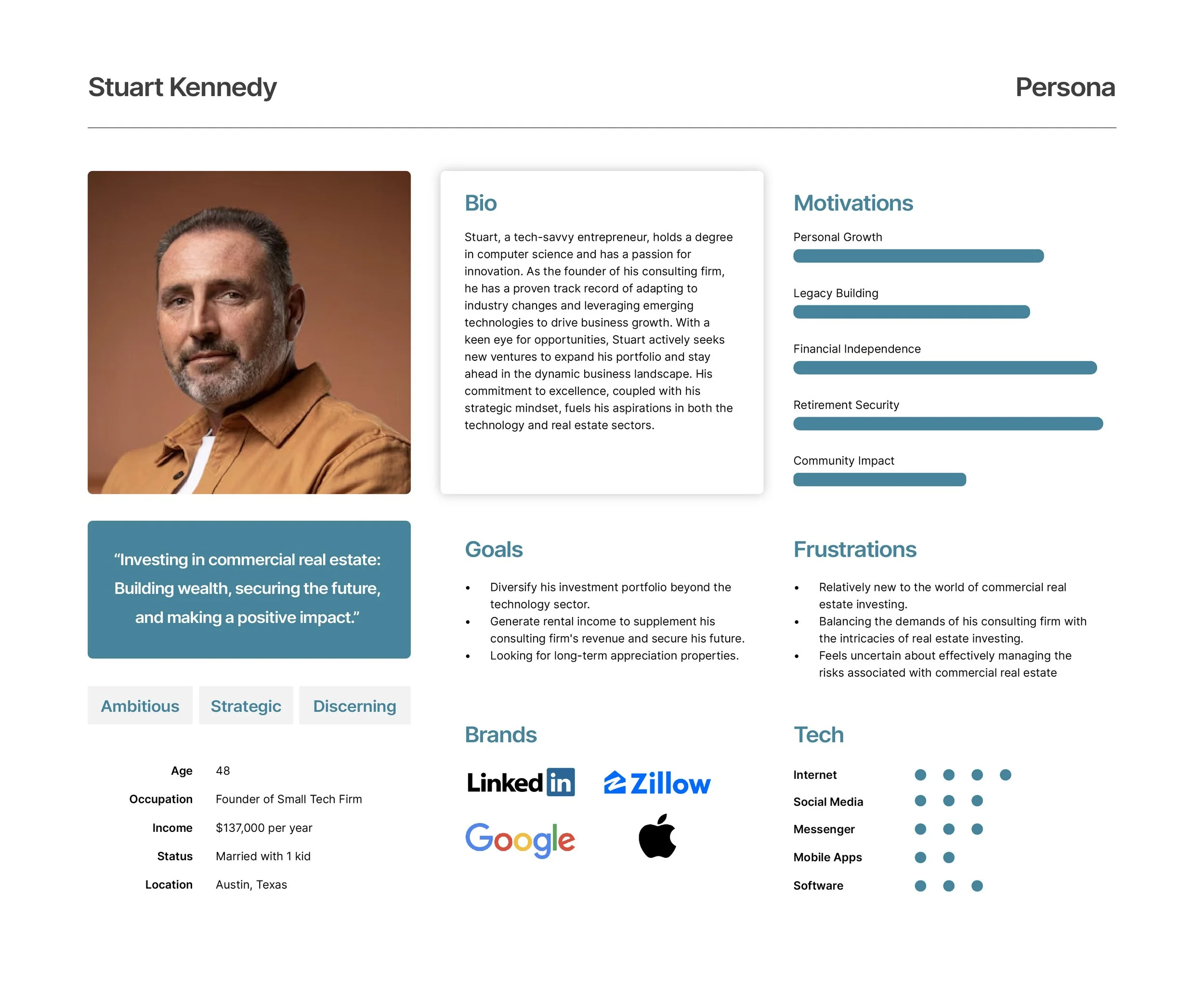 I engaged in thorough market research to gain insights into the requirements, drivers, and actions of businesses seeking commercial real estate. We specifically targeted individuals with significant experience in leasing or purchasing commercial properties. Following the collection and analysis of qualitative data from diverse user interviews, we crafted empathy maps and persona profiles to encapsulate the collective perspectives of our target audience.